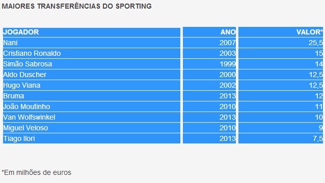 *Na lista das 10 maiores transferências apenas Duscher e Wolswinkel não são jogadores formados no Sporting.